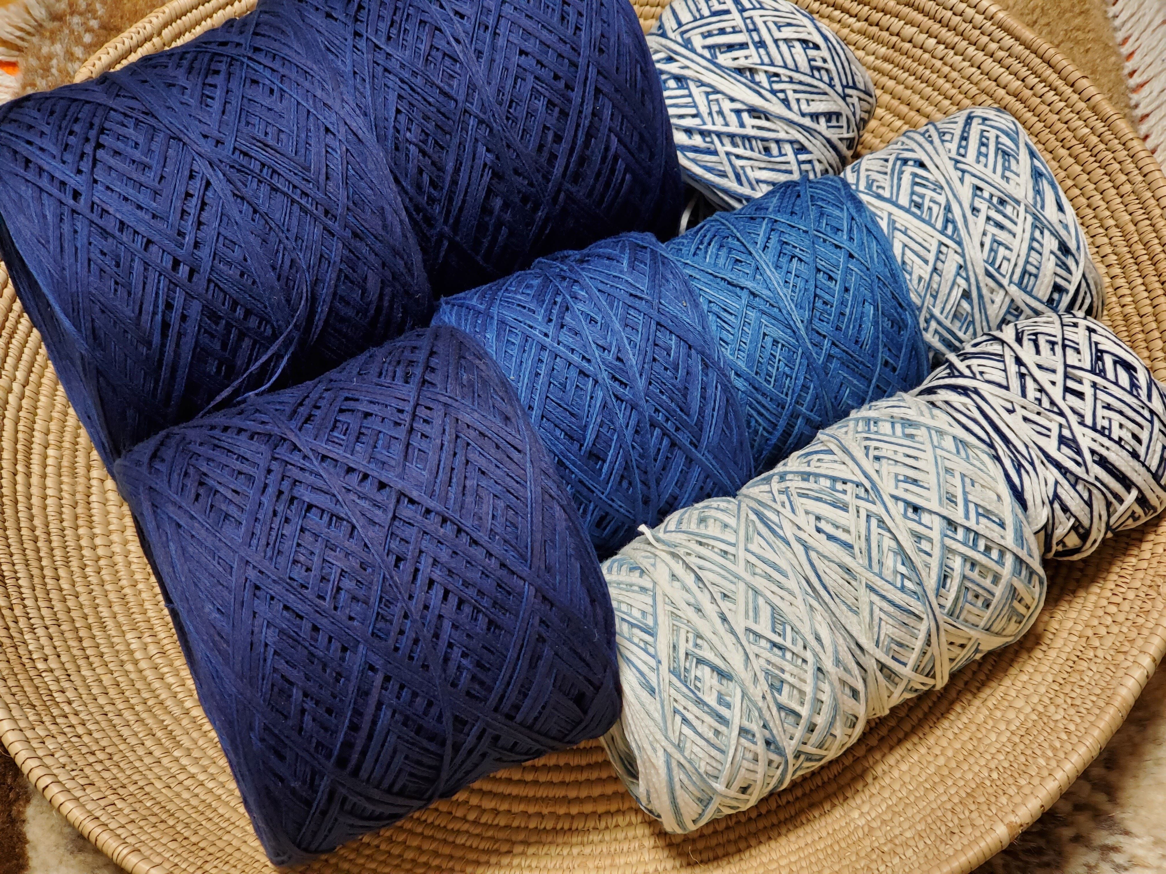 本藍染めのコットンリリヤン(アイコードヤーン)と、コットン20/4番手の引き揃えになります。