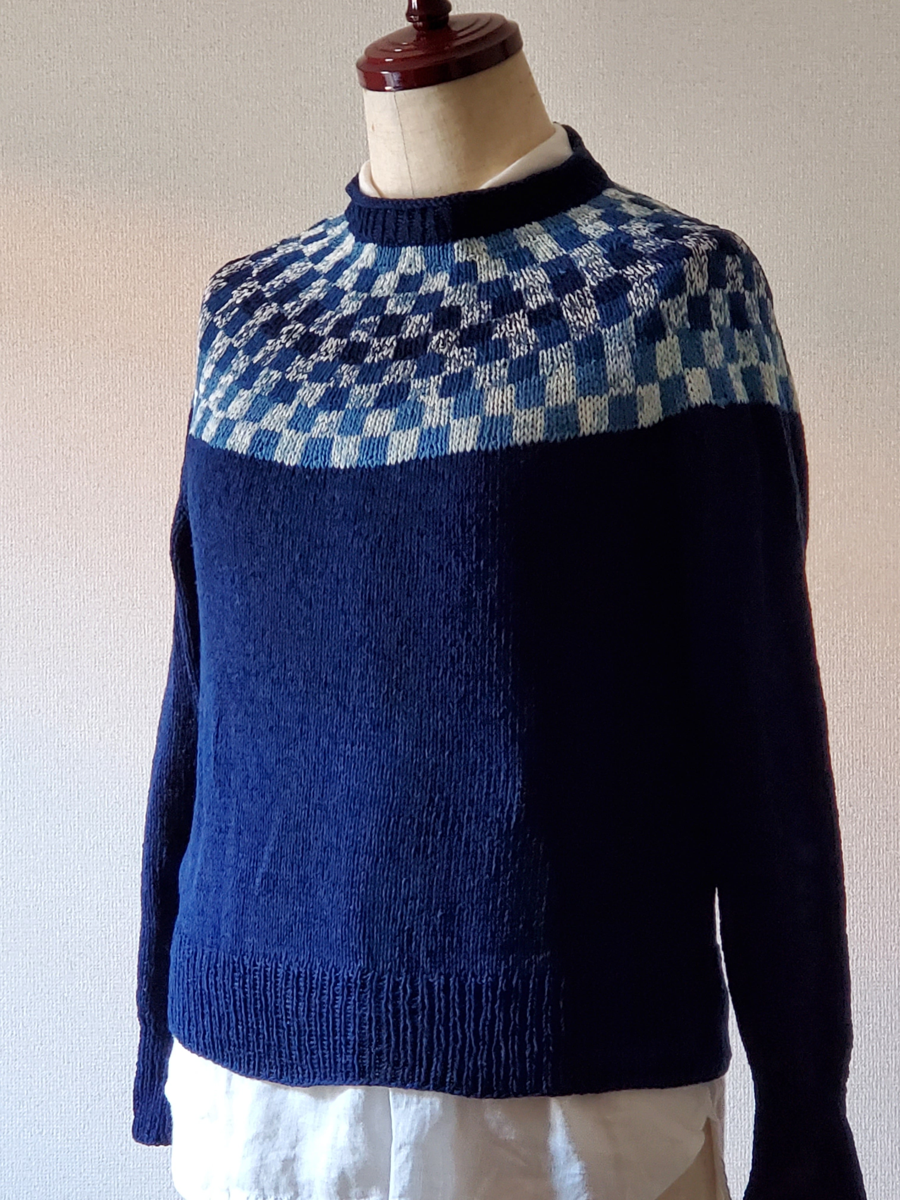 メインカラーは濃紺でデザインしましたが、濃色のため他の糸と比べて、編むときに擦れて色が落ちます。